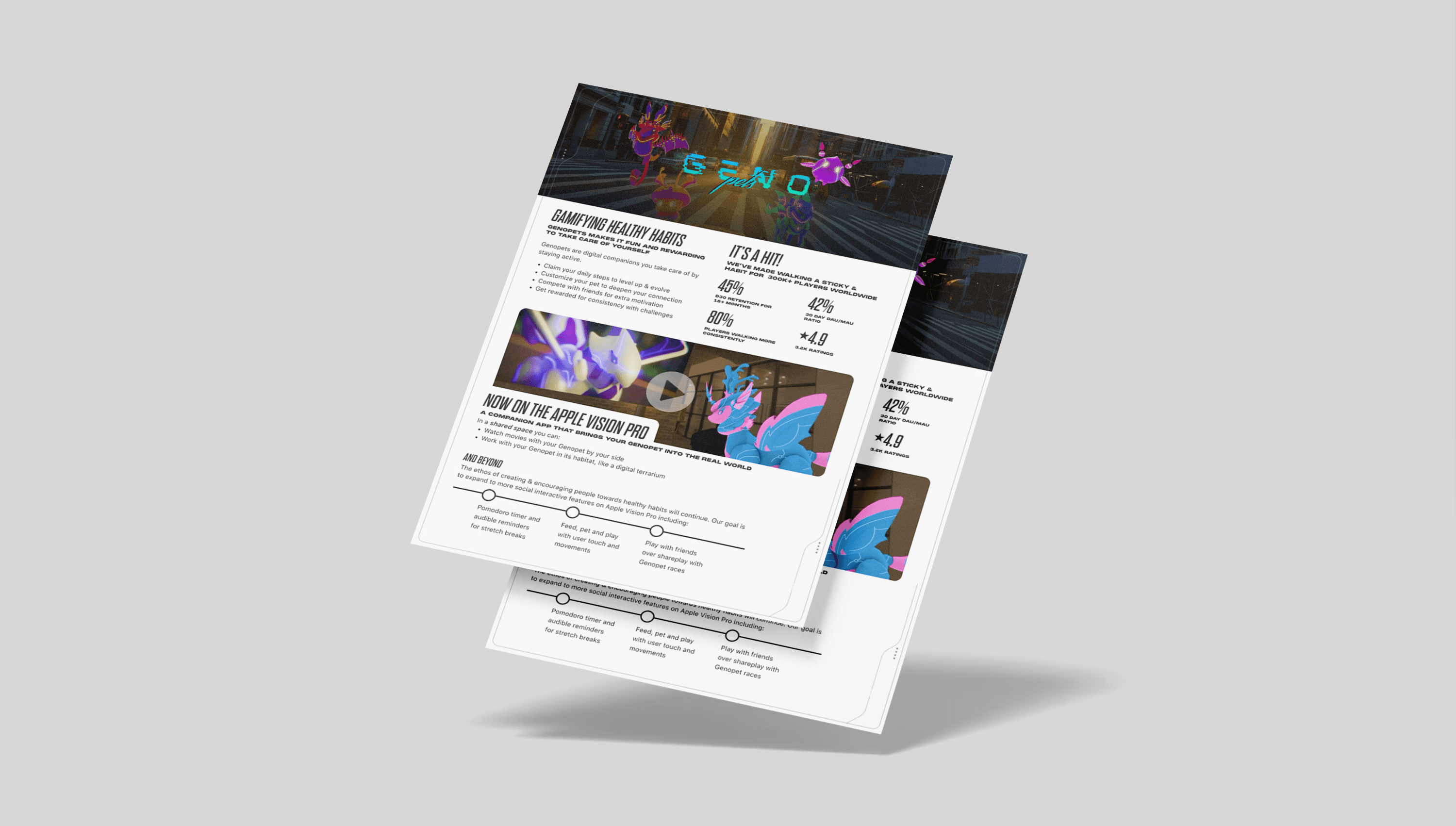 To launch Genopets on Apple Vision Pro, I led all marketing efforts—from a cinematic mixed-reality trailer to App Store assets and a one-pager for Apple. The campaign positioned Genopets as one of the first blockchain games on Vision Pro and showcased how AR can deepen the bond between players and their digital pet.